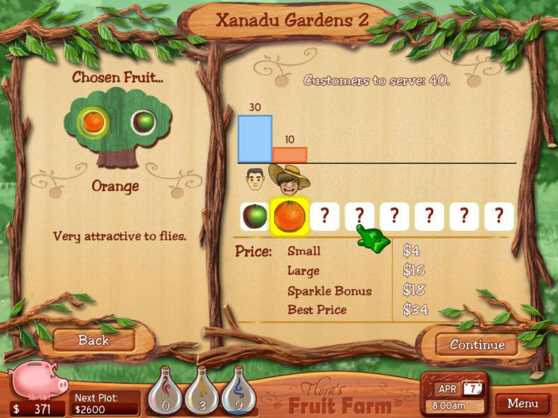 В Flora’s Fruit Farm не придется выращивать ничего, кроме плодоносных культур и цветов, отвлекаться на животноводство не нужно. Игра проста в управлении, но достаточно разнообразна, например, только одних видов деревьев здесь представлено полсотни. Игрок может в любой момент доверить управление плантацией искусственному интеллекту, либо же взять одно из особых заданий. Все действия выполняются с помощью мышки.