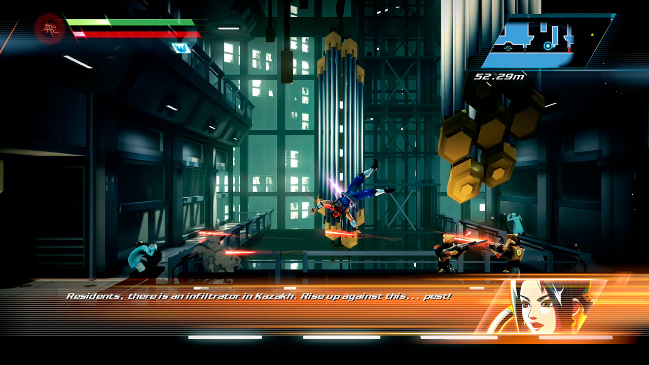Приключенческий экшен-платформер про ниндзю по имени Хирью, которому необходимо уничтожить одного из самых могущественных злодеев в мире – главу ордена Мейо. Проект является вольным ремейком одноименной игры 1989 года. Изначально наш персонаж обладает только плазменным клинком, а также рядом акробатических умений, но постепенно герой учится различным приемам – метание ножей, отражение пуль, заморозка противников и пр. Впоследствии герой также получит трех роботов-напарников – орла, пантеру и дроида.