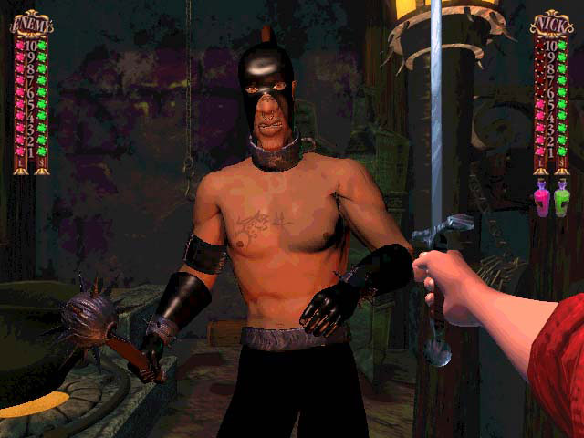 Управление героем происходит с помощью мышки, нажимает влево герой идёт влево, вправо идёт и так далее, Вид от первого лица. Действовать в сражениях можно двумя способами – стрельба из пушки выполненная в виде стрельбы как в тире. И поединки с другими противниками, в которых есть ваша полоска жизней и врага. Парирования в игре нет, но можно атаковать, отходить в сторону или выпить из бутылки чтобы восстановить полоску здоровья.