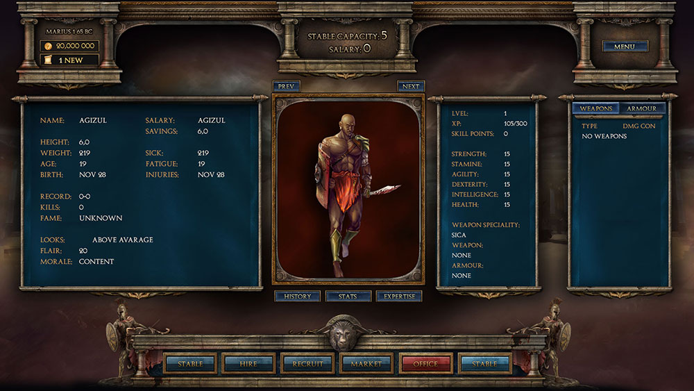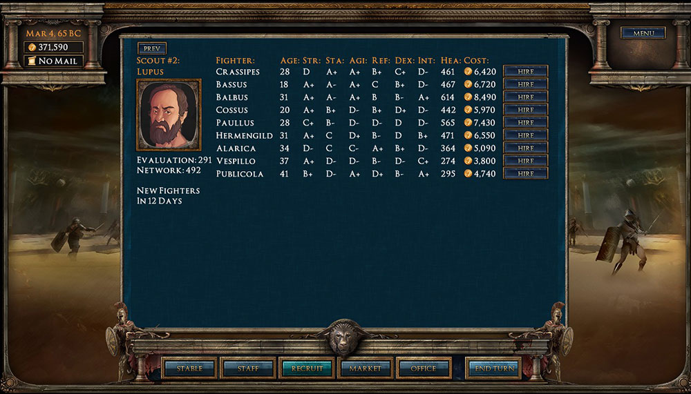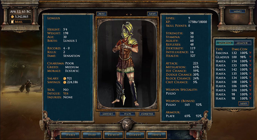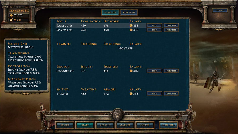 Игрок должен набирать новых бойцов, распределять снаряжение, прокачивать навыки и улучшать характеристики своих подданных. На каждую схватку можно делать ставки, что позволит выиграть большие суммы и развить гладиаторский бизнес еще больше. В целом игра является симулятором менеджера в нестандартном сетинге.