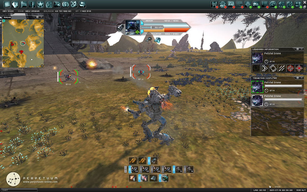 Perpetuum – многопользовательская онлайн игра действие которой происходит на поверхности планеты. По сюжету игры – человечество испытывало энергетическую нехватку и в космосе нашла другую планету, с достаточными ресурсами, но столкнулась с другой роботоподобной расой, которая также хотят захватить этот ресурс. Сражаться приходится в качестве пилота одного из гигантских роботов. Начав свой игровой путь с маленького механоида, геймер постепенно накапливает опыт и деньги, которые он может потратить на новые исследования, новые модули и, соответственно, новых роботов.