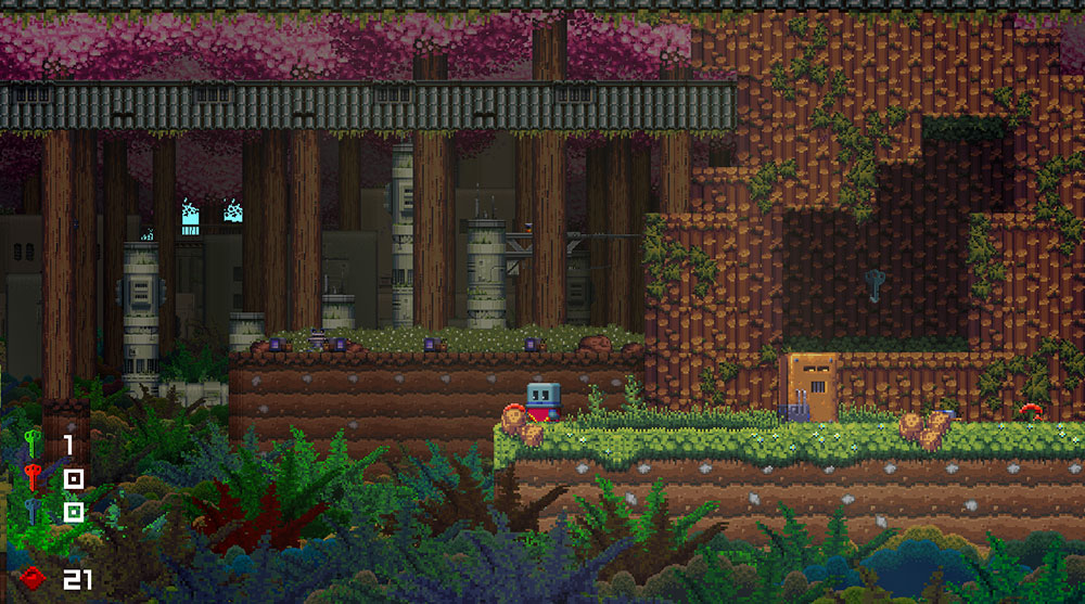 Скучать вам точно не придётся: у нашего робота в наличии есть двухметровый цветок (своего рода зонтик, чтобы не разбиться насмерть), реактивный ранец (который очень нехило прокачевается с помощью кристалов, которые зачастую спрятаны в очень укромных уголках), ну и самое вкусное увидите сами.