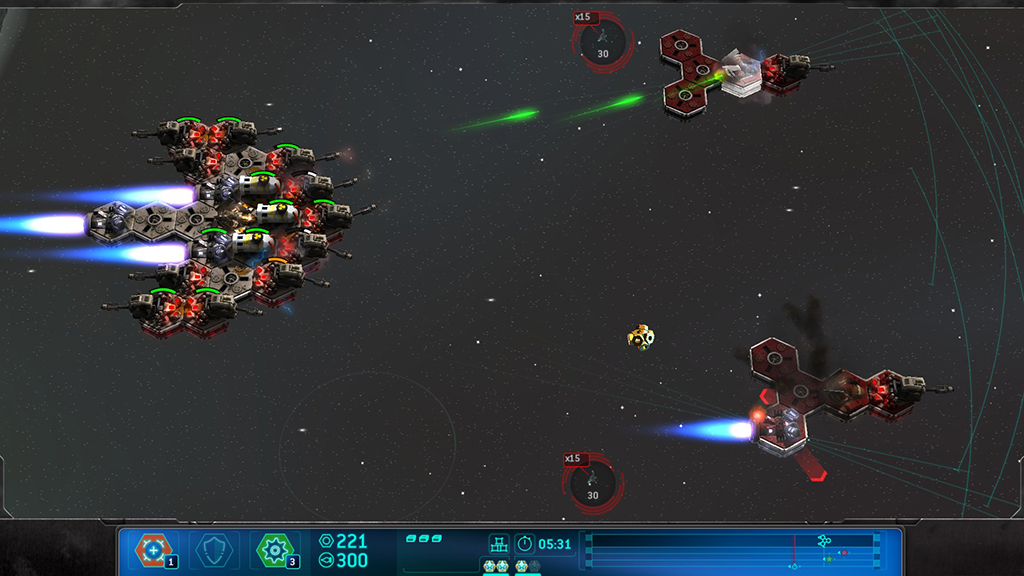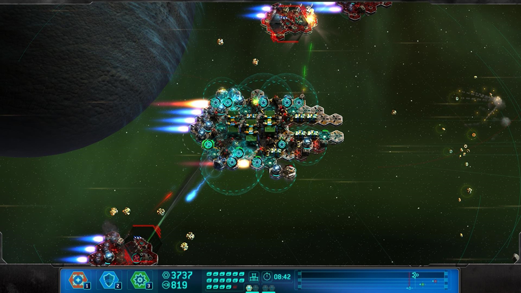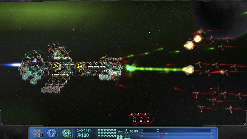 Игровой процесс здесь заключается в следующем – у вас есть космический корабль, сделанный из панелей шестиугольной формы, которые соединяясь вместе, образуют звездолеты различных форм и размеров (в зависимости от миссии). В течение миссии вы должны использовать имеющиеся ресурсы, строя на панелях башни, турели, ракетные установки, щиты и ускорители, и выживать в крайне недружелюбном космосе, стараясь наряду с этим не потерять груз и выполнить свою задачу.