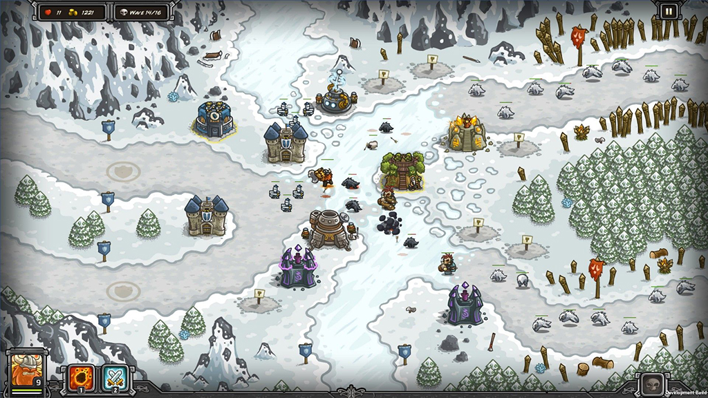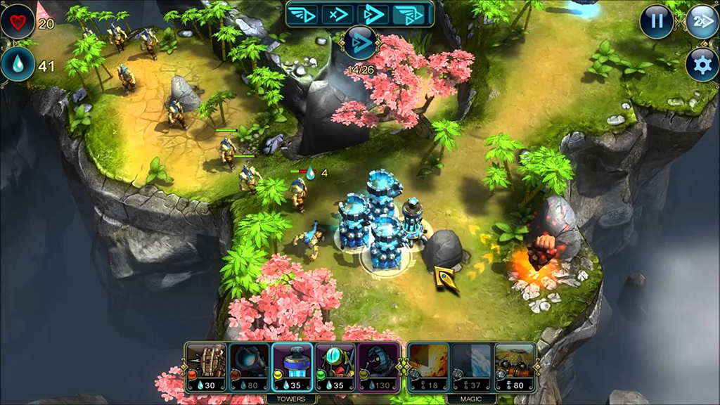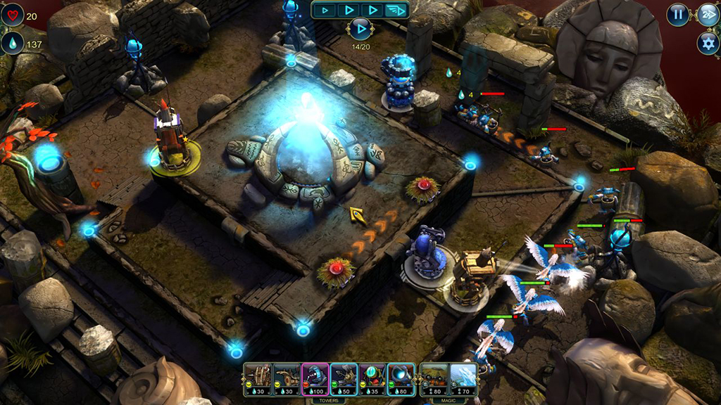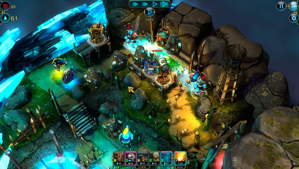 По своей механике проект является классическим представителем жанра. У нас есть небольшие уровни с толпами врагов, идущими по заранее известному маршруту и множество башен. Уровни довольно разнообразные с заснеженными горами, каньонами и даже действующими вулканами. Места установки башен заранее предопределены, что на более поздних уровнях выливается в навязывание игрокам определенной тактики. Игра хорошо продумана и отлично сбалансирована.