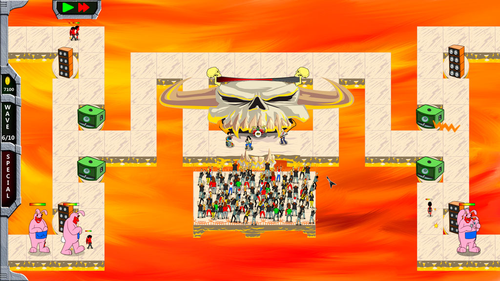 Игровой процесс здесь строится следующим образом: у нас есть сцена, на которой играет популярная рок-банда, есть петляющая по уровню дорожка, по которой идут противники и есть колонки, которые мы должны расставлять вдоль дорожки, чтобы с помощью музыки уничтожать все, что по ней движется. Колонки можно улучшать, но и рядовые противники постепенно становятся разнообразнее (их более 20-ти видов) и сильнее. Кроме того в игре присутствуют боссы, которых не так-то просто убить.
