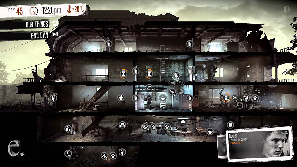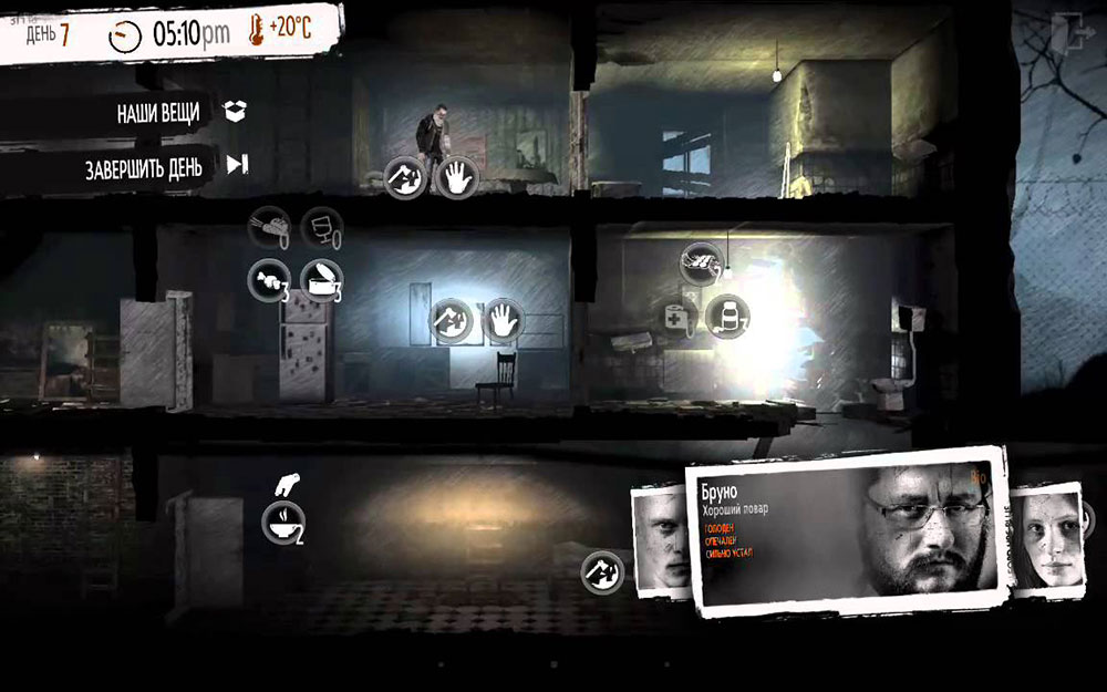 Итак, у нас несколько выживших и главная наша задача – пережить войну. Геймплей разделен на две части: ночную и дневную. Ночью игрок добывает пропитание, медикаменты и другие необходимые вещи. Днем – отстраивает убежище, производит инструменты и оружие и взаимодействует с персонажами. Еды и медикаментов постоянно критически не хватает, поэтому не раз вам придется принимать сложные моральные решения, от которых напрямую зависит судьба персонажей. В игре присутствует элемент случайности – многие события в каждом новом прохождении могут протекать по-разному.