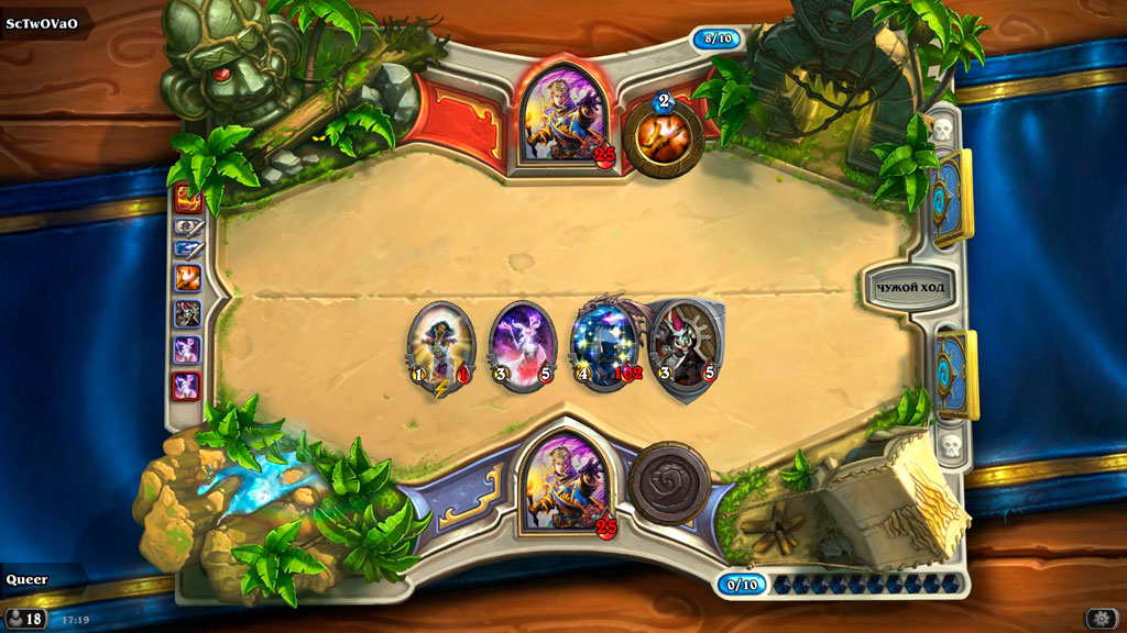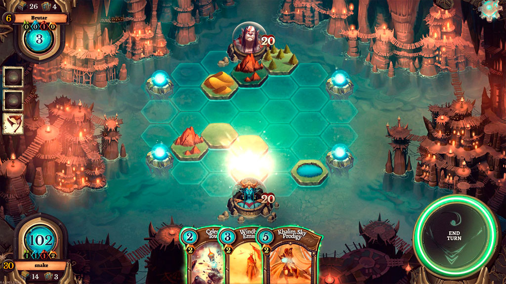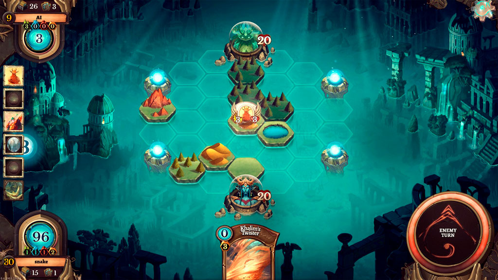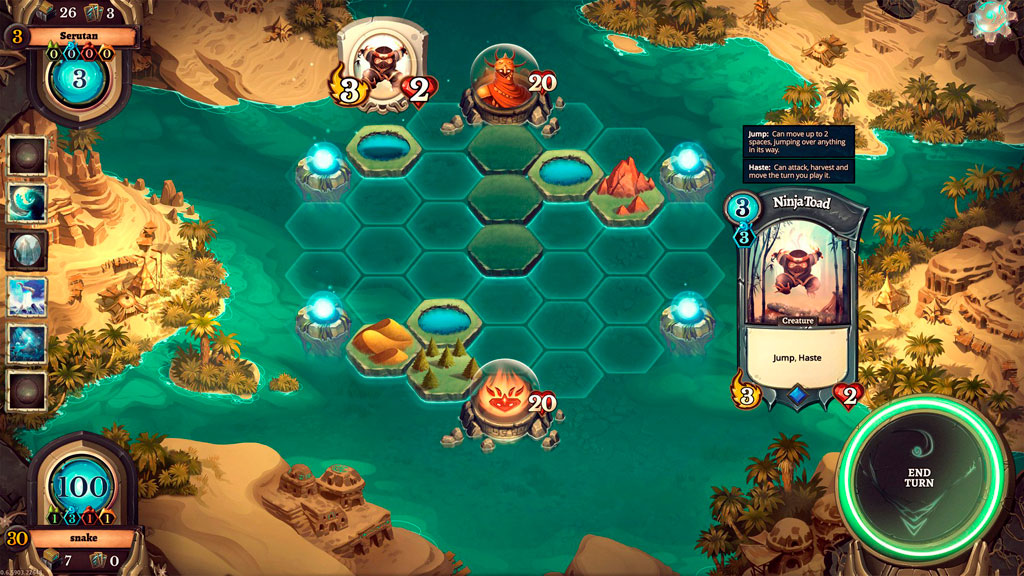 Основная задача здесь – нанести противнику 20 единиц урона. Изначально все игровое поле заполнено водой, однако каждый свой ход мы можем создавать земли для своих существ. Причем существа могут потребовать не 1, а сразу 2 гекса на поле, находящиеся под вашим контролем, а особо мощные карты вообще заставят вас комбинировать несколько типов ландшафта. Занятую же противником землю всегда можно изменить, смешав ему все планы.