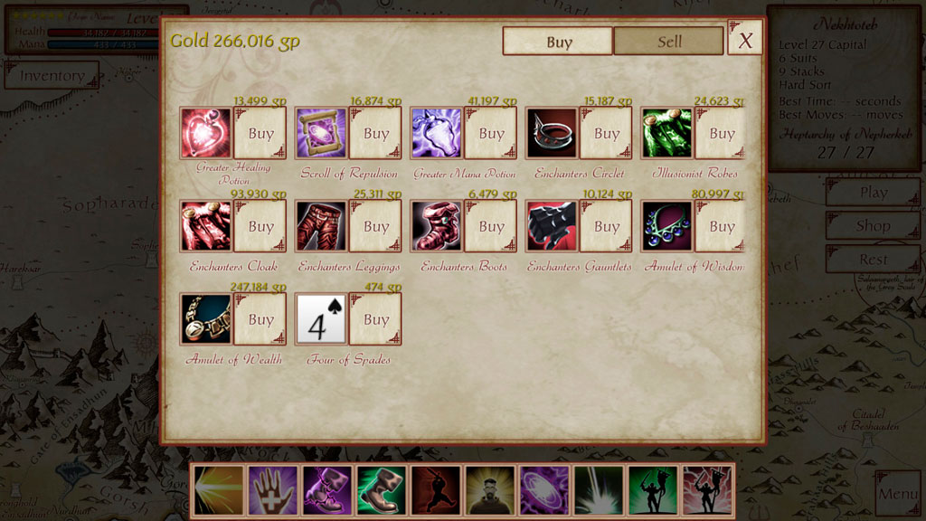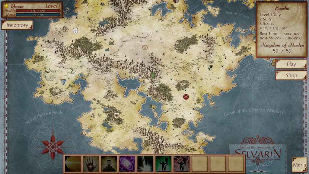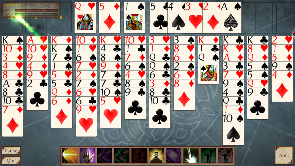 Геймплей же здесь выглядит следующим образом – вы передвигаетесь по глобальной карте и освобождаете города. Каждая раскладка пасьянса – это отдельное сражение за определенное поселение или достопримечательность. Сражение выглядит следующим образом – игрок раскладывает пасьянс, но в определенный момент один из столбиков начинает мигать. Это означает, что из этого столбца нужно переложить несколько карт в другое место. Не успели переложить – получите урон. После победы игрок получает опыт, повышая свой уровень, и золото, которое можно потратить на магию, броню и пр.