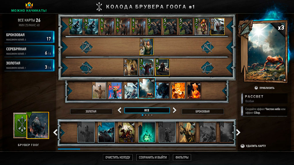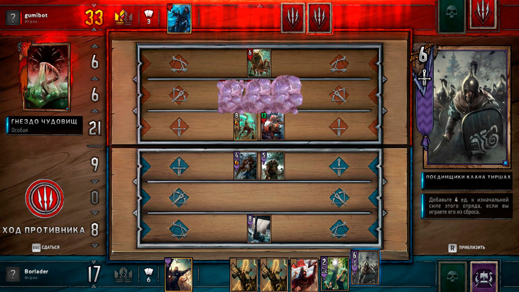 Карточная коллекционная игра, созданная по вселенной Ведьмака. В основе игрового процесса лежат карточные сражения двух игроков друг против друга предварительно собранными колодами, которые могут состоять из 25-40 карт. Цель игры – с помощью различных карт усиливать свои отряды и ослаблять отряды соперника, добиваясь превосходства по очкам.