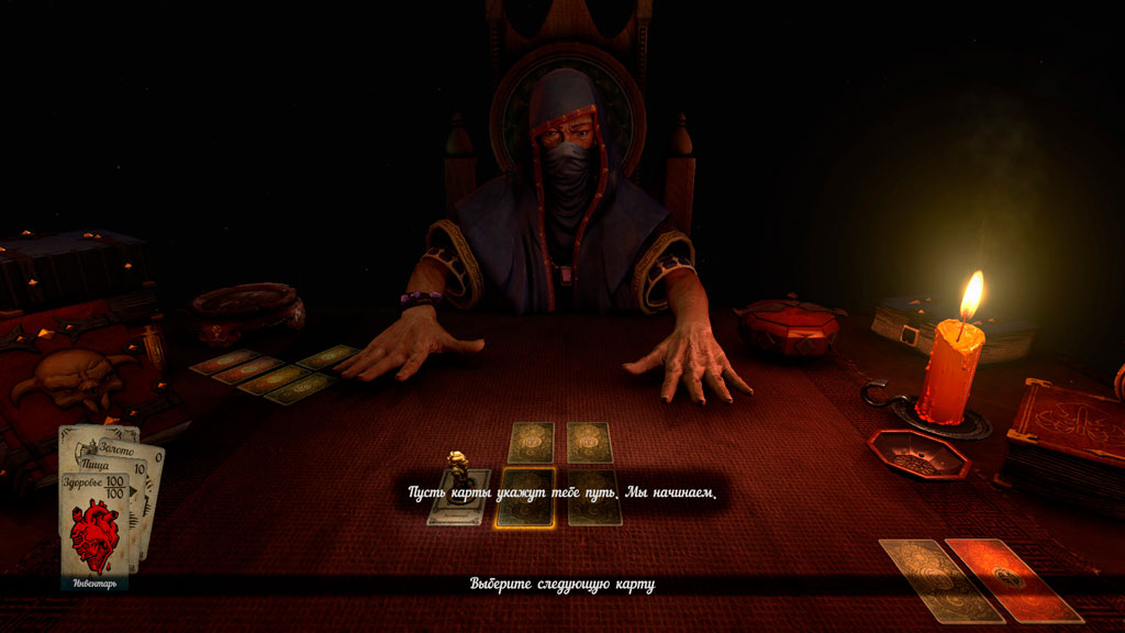 Эти и другие игровые возможности реализуются исключительно в виде манипуляций картами на игровом столе, а львиная доля визуализации происходящего происходит в воображении игрока. Впрочем, карты все-таки имеют простенькие иллюстрации, а фоновая музыка в игре вместе с качественным текстовым описанием действий и объектов заслуживает всяческих похвал. Многие механики игроку нужно понимать самому методом проб и ошибок, а неверное действие нередко будет сопровождаться смертельным исходом.