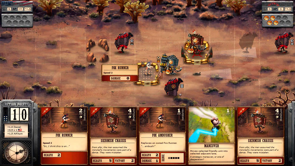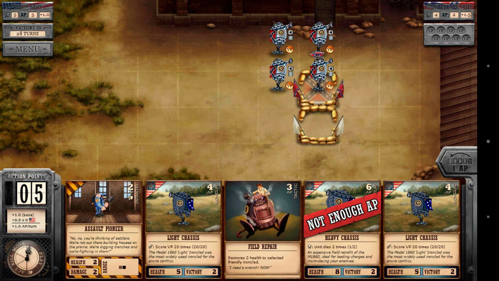 Смесь карточной игры и пошаговой стратегии в оригинальном сэттинге альтернативной истории Гражданской войны в США, где наравне с людьми участие в сражениях принимают и всевозможные паровые роботы. Сюжет здесь преподносится в виде отлично нарисованного комикса, наблюдать который можно до и после каждой миссии. Наравне с отличным сюжетом отдельного внимания заслуживает и великолепная музыка.