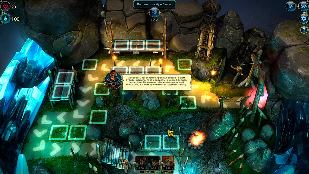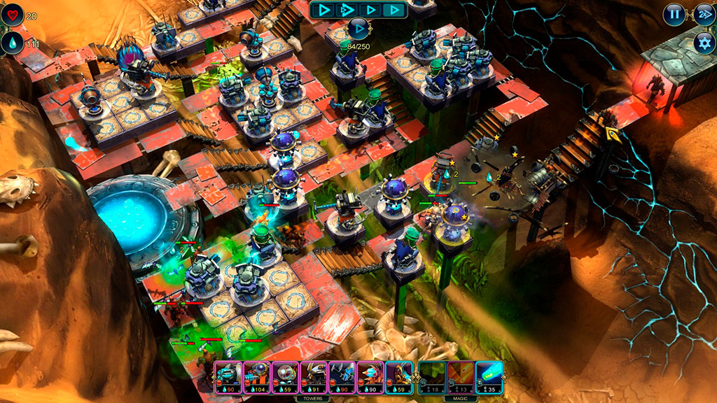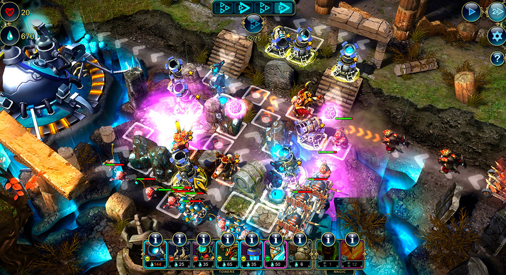 Игровой процесс здесь использует классические механики жанра башенной защиты. Т.е. на различных уровнях мы возводим башни, улучшаем их и не даем толпам монстров добраться до нашей базы. Каждая башня, заклинание или башенный апгрейд – это определенная карточка, колоду которых мы можем собирать перед каждым уровнем. По мере прохождения мы получаем новые карты или улучшаем старые, корректируя свою тактику, исходя из того, какие карты нам сейчас доступны и могут пригодиться, в зависимости от условий миссии.
