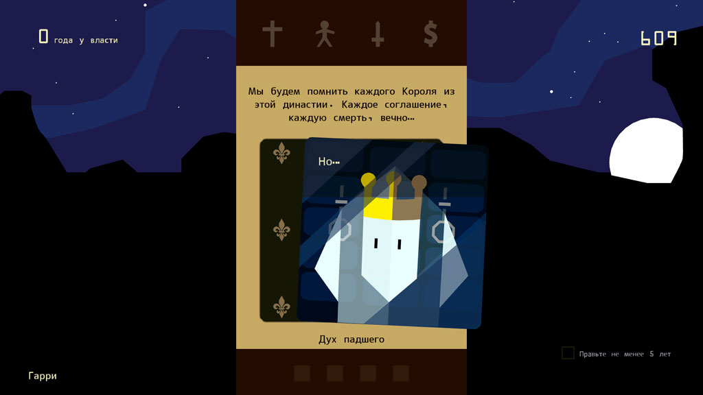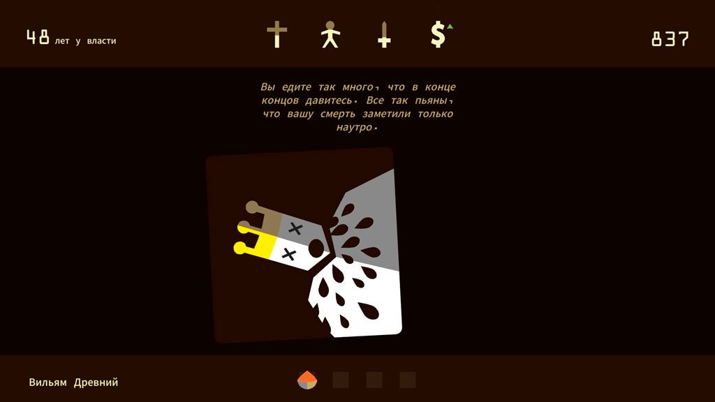Карточная игра, в которой за 5 минут игры можно успеть спуститься в подземелье, подавить восстание народа, наплодить бастардов, выгодно жениться и погибнуть от рук восставшей армии. Ситуаций, порождаемых рандомом множество, и каждую вам придется решать одним из двух предложенных способов. Причем механика выбора здесь основана на картах – вам буквально каждый ход даются карточки, на которых изображены советники или посетители короля, которые что-то рекомендуют, а игрок может выбрать реакцию короля, сбрасывая карту влево или вправо.