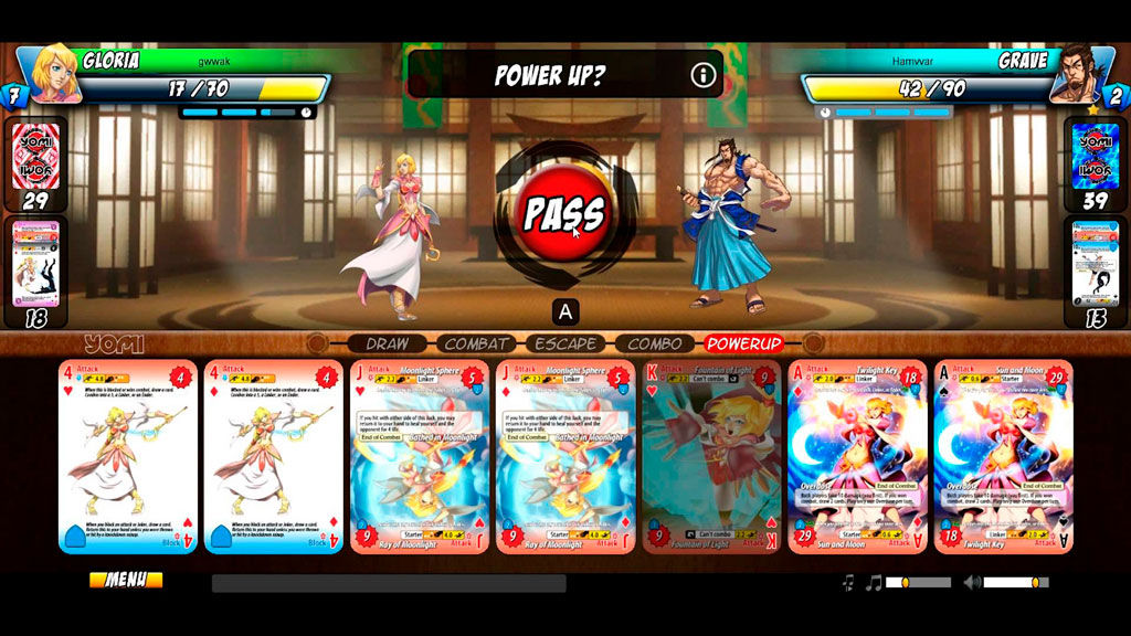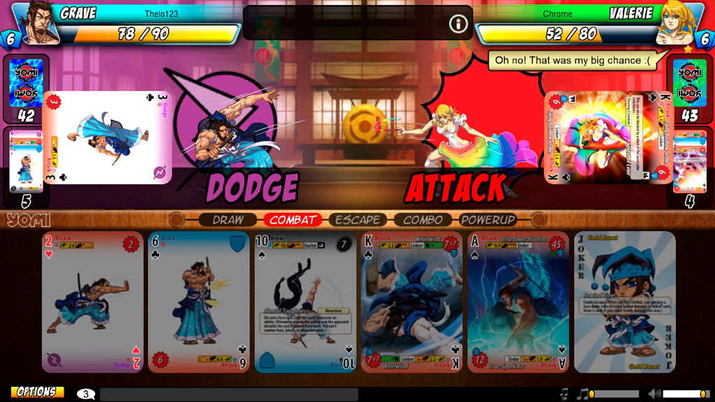Боевая система здесь напоминает игру «камень-ножницы-бумага». С той лишь разницей, что у нас имеется атака, уклонение или блок и бросок, которые отличаются по своим свойствам и тактикам применения. Также есть специальные карты (валет, дама, король) и супер-карты (туз, джокер). Основной упор в бою делается на анализ карт оппонента и предугадывании карт, которые могут находиться в его руке.