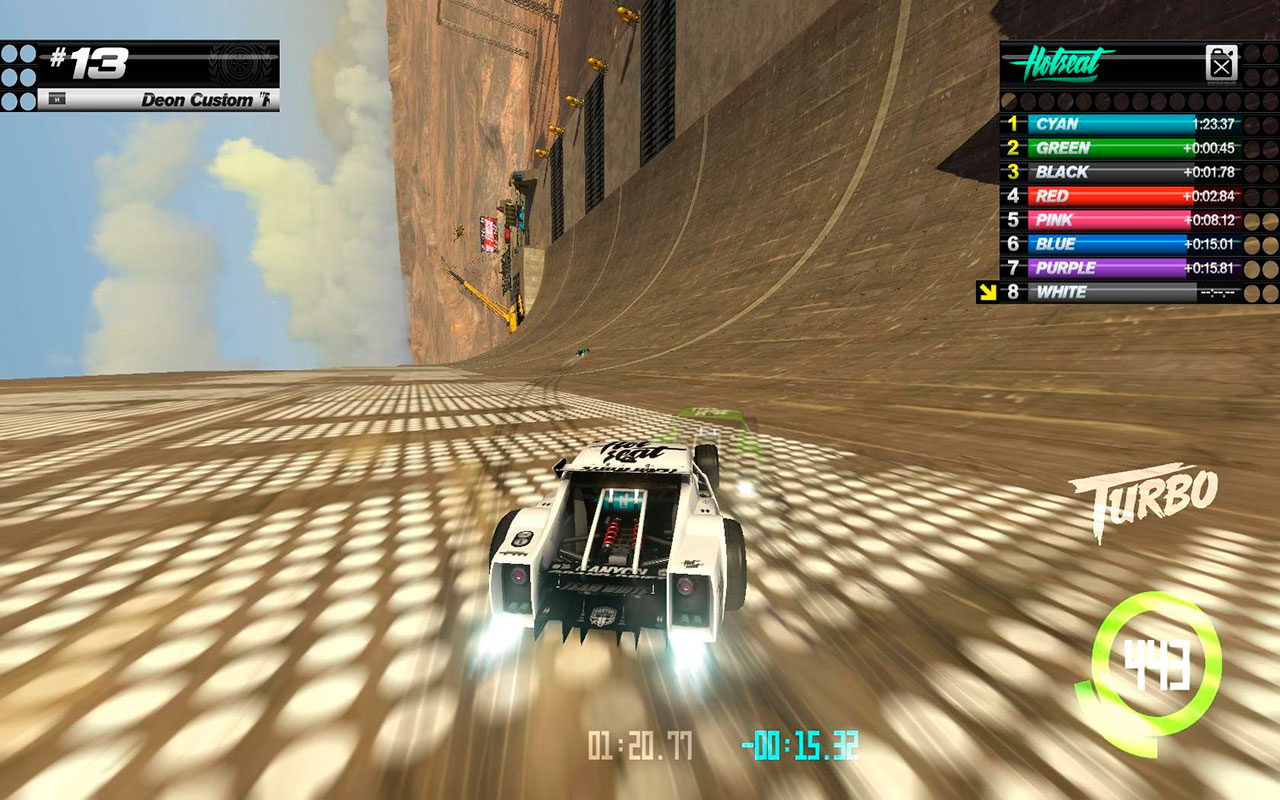 Гоночный инди-раннер, выполненный в стилистике аркадных автоматов 80-х годов. В игре простое управление и достаточно сложный геймплей (на прохождение первых трех уровней вполне можно потратить пару часов). На трассе четыре полосы, в качестве препятствий выступают подсвеченные платформы, небрежно разбросанные по всему пути. Периодически во время езды меняется ракурс камеры, что разнообразит игровой процесс.