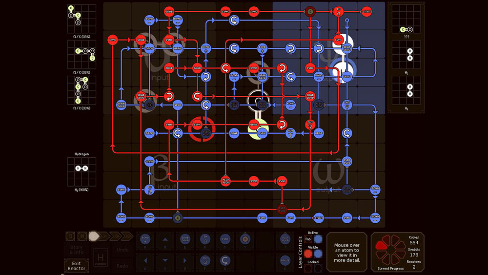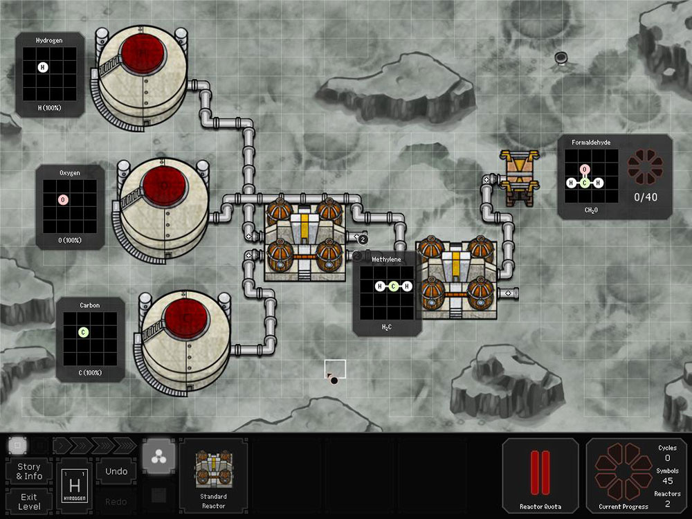 Синтез элементов происходит в специальном реакторе, представляющем собой поле 10х8 клеток. У поля имеется два входа для подачи элементов и два выхода для их отгрузки. Также в реакторе есть два манипулятора-уолдо, которые способны выполнять различные действия над элементами. Задача игрока запрограммировать определенный алгоритм и получить в итоге необходимое соединение.