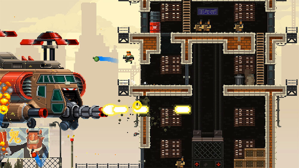 2D-платформер, который прямо-таки пропитан ностальгией по героям старых боевиков 80-х и 90-х годов. Игровых персонажей здесь более чем достаточно, при этом каждый является пародией на реально существующего героя, в частности, в игре можно побегать за Рэмбо, Терминатора, Джона Макклейна, Чака Норриса и др. Каждый герой обладает одной бесконечной и одной суператакой, на использование которой тратится энергия.