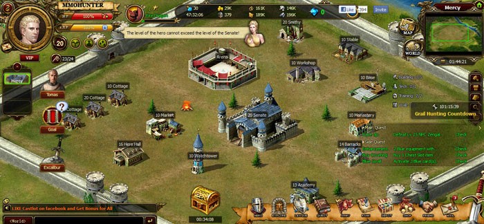 Castlot браузерная онлайн стратегия действия происходят в древней Англии в VI веке, во времена рыцарей и войны короля Артура с саксонскими захватчиками. Игра включает в себя и как стратегию в которой нужно строить и развивать свой город, и большую армию с помощью которой вы будете захватывать новые земли и ходить в походы на врагов. Так и элементы РПГ – у вас есть основной герой которого вы прокачиваете набирая очки опыта на арене сражаясь с другими героями игроков. За очки повышается уровень героя и можно покупать для него новое снаряжение и умения.