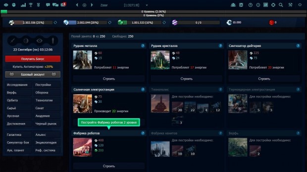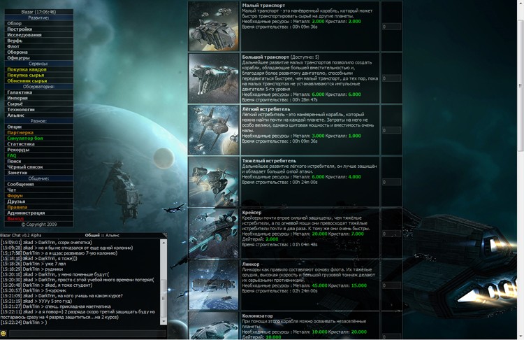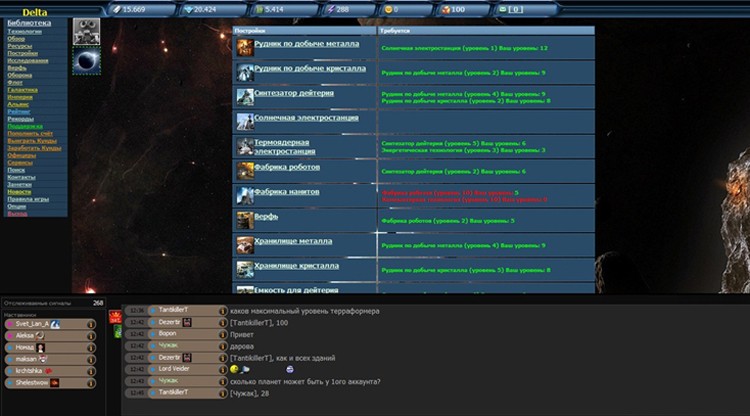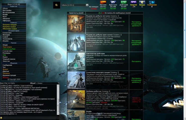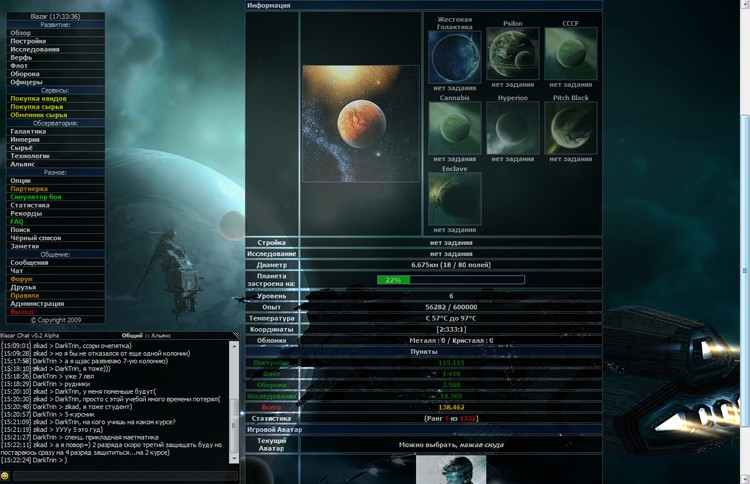 Blazar – ну, вы, поняли что про космос и прямо в браузере. Игроку предстоит управлять целой планетой. Пользователю необходимо развивать планету, добывать различные ресурсы, возводить здания и создать мощный космический флот. Игра мало чем отличается от привычных MMO-стратегий. Единственное существенное отличие заключается в том, что под вашим управлением окажется не только планета, но и ее спутники. Стоит упомянуть об особой «Звезде Смерти», которую может создать любой игрок. Звезда требует множество сил, ресурсов и времени, зато она может уничтожить спутники других пользователей. Кстати, Звезда Смерти имеет неповторимый дизайн, за что можно похвалить разработчиков.