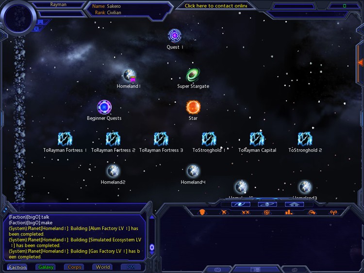 Galaxy Online II – браузерная онлайн игра. Дело как и положено начинается с небольшой суммы бабла, необжитой планеты и постройки зданий и военного флота. Интересной особенностью игры является чрезвычайно сложная военная состовляющая. Большое количество разновидностей кораблей флота, сотни модификаций и командиров со своими характеристиками и бонусами для кораблей под его управлением.