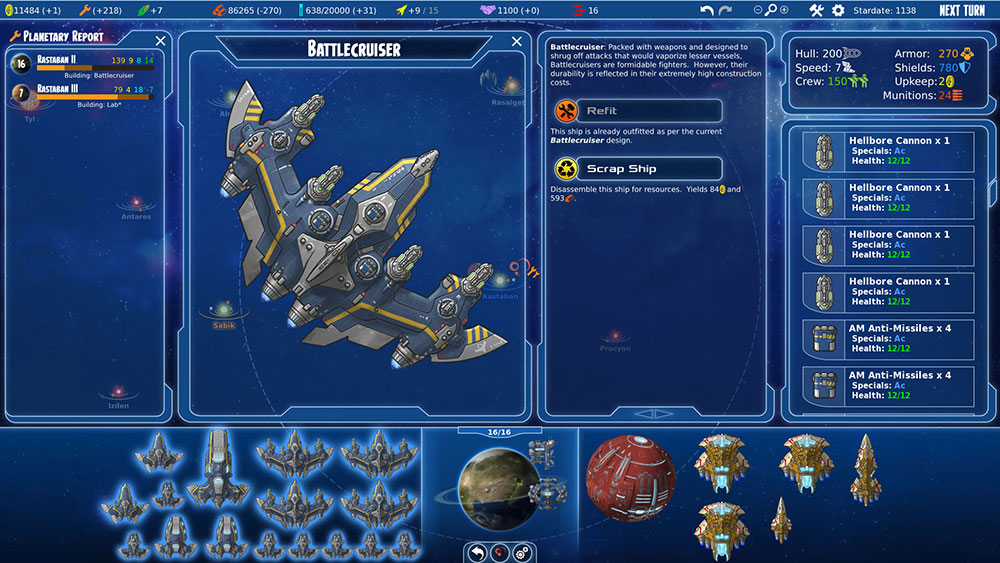 Боевые космические корабли разделены на четыре класса истребители, корветы, тяжёлые крейсеры, и линкоры. Число боевых единиц в каждом группе класса ограничено. Например истребителей может быть 4 в группе а крейсеров всего лишь 1. Есть другие типы кораблей, но они предназначены не для войны, а для решения других задач встающих перед игроком.